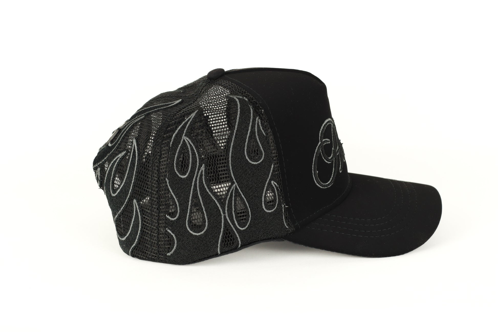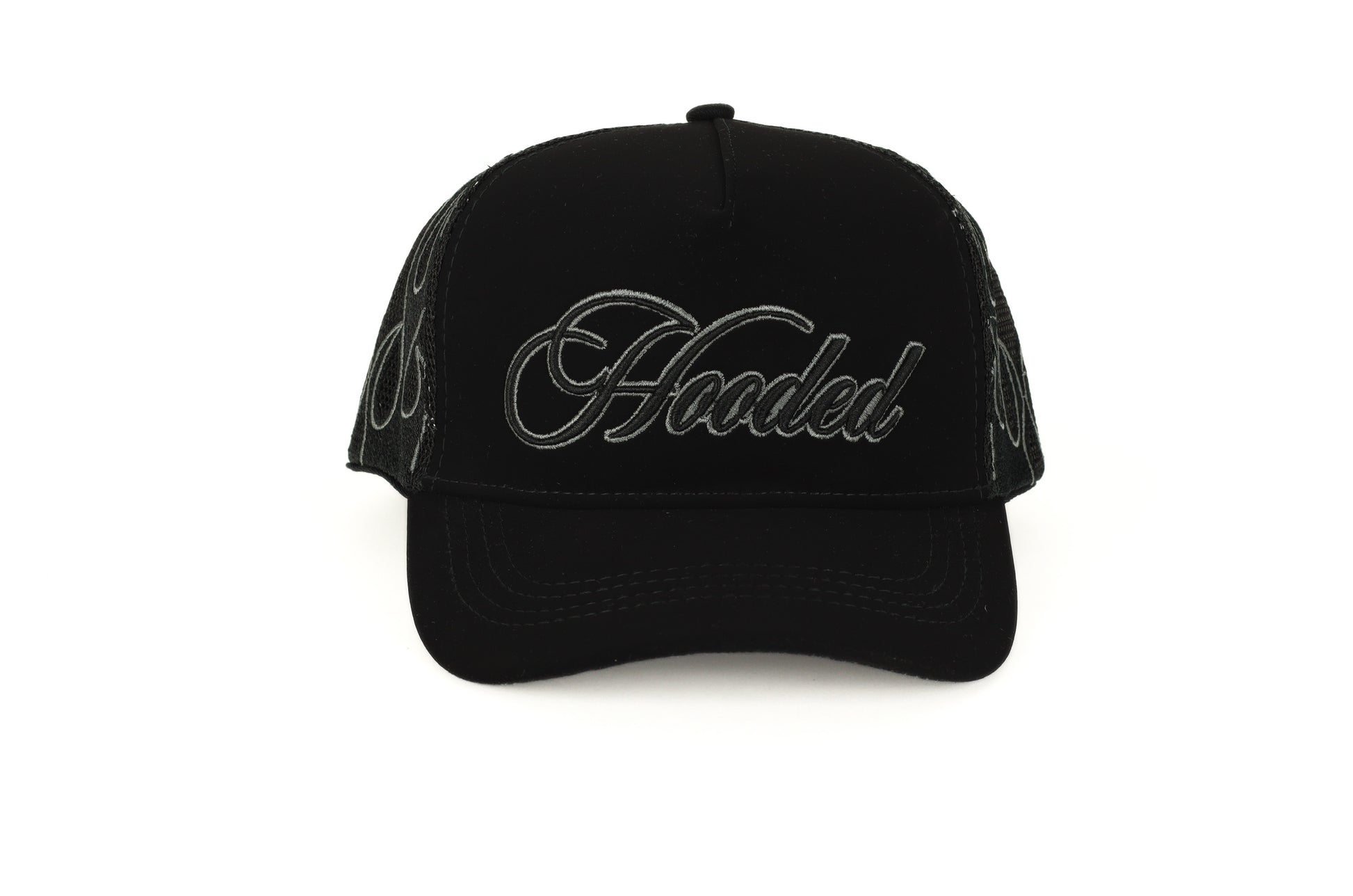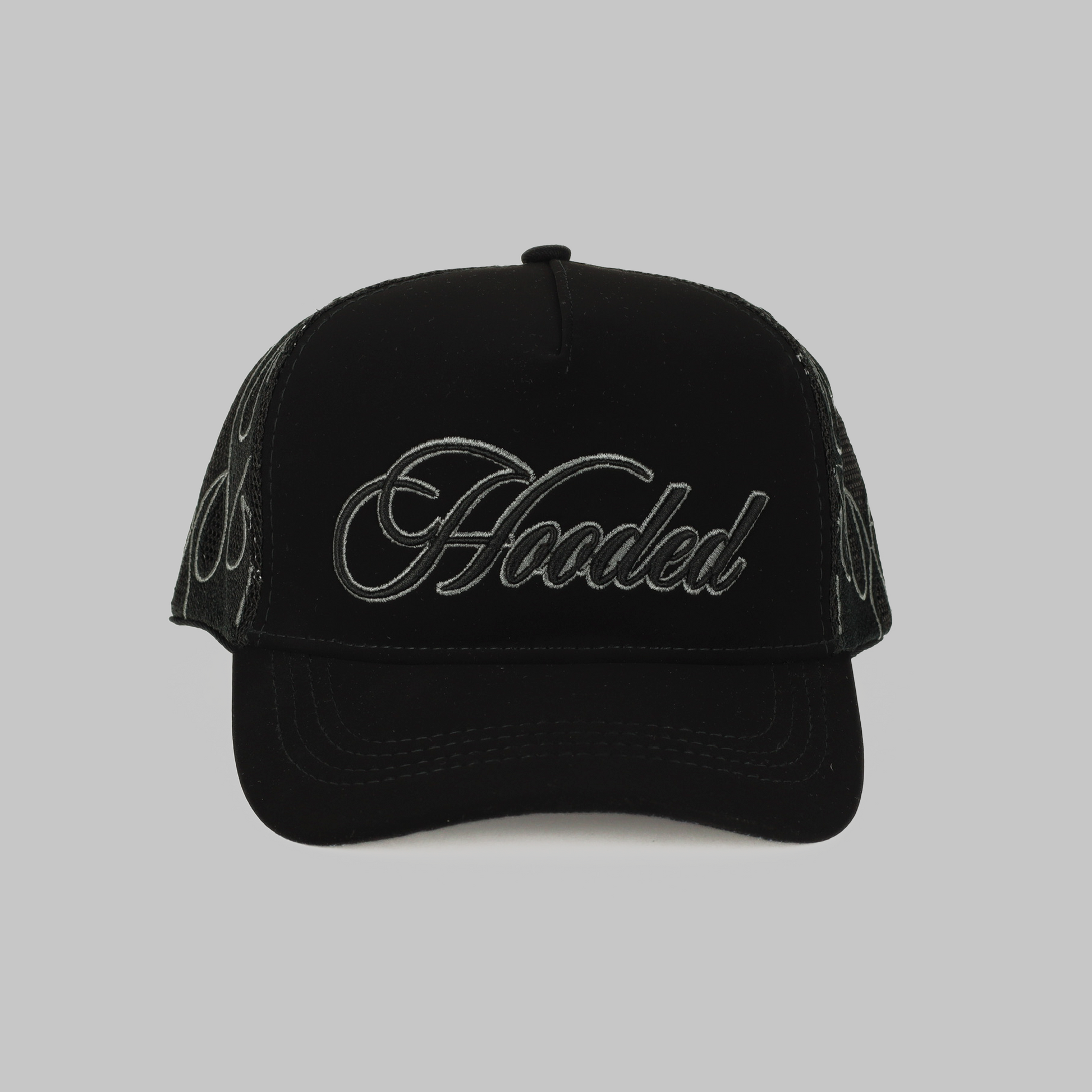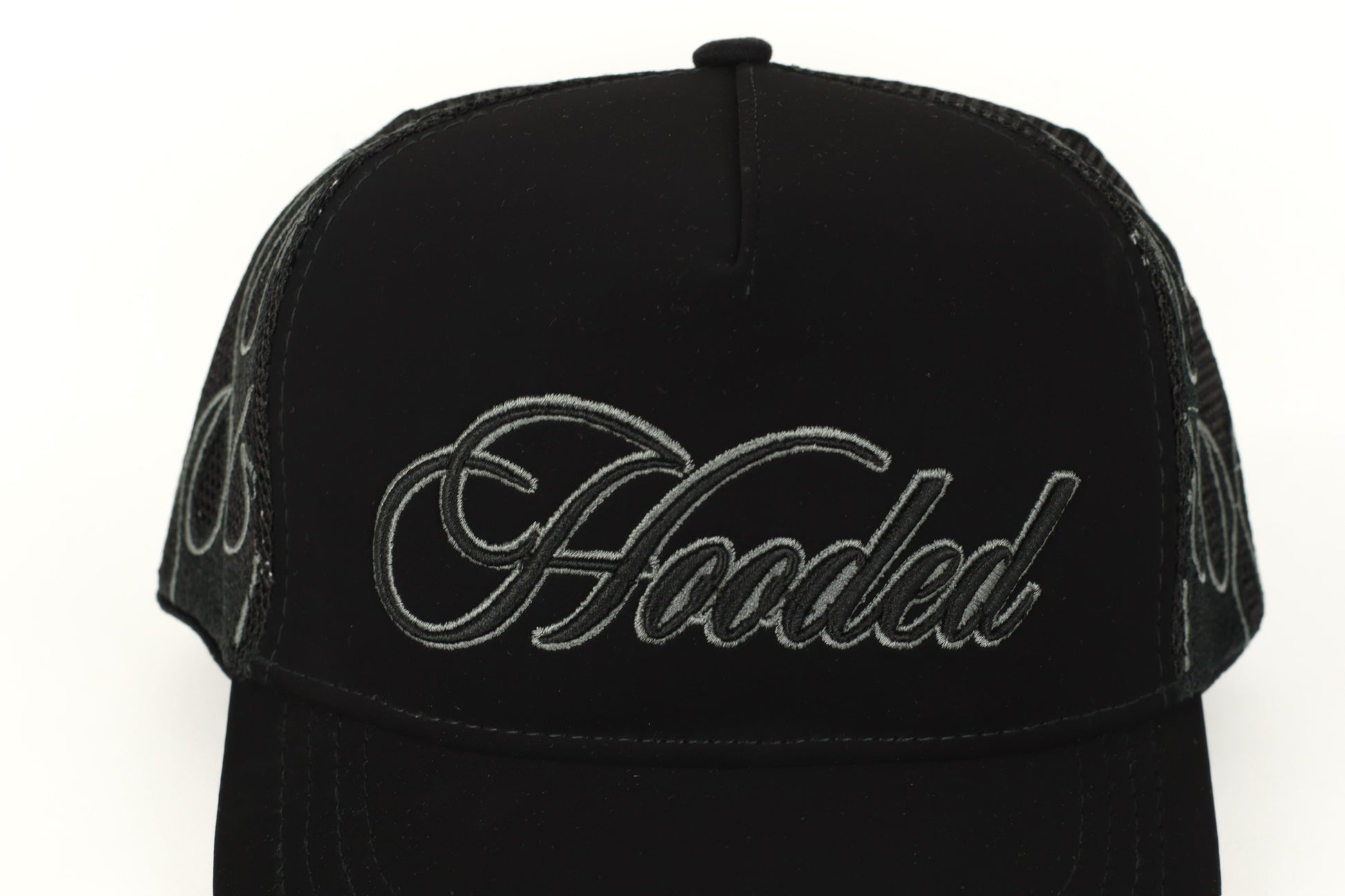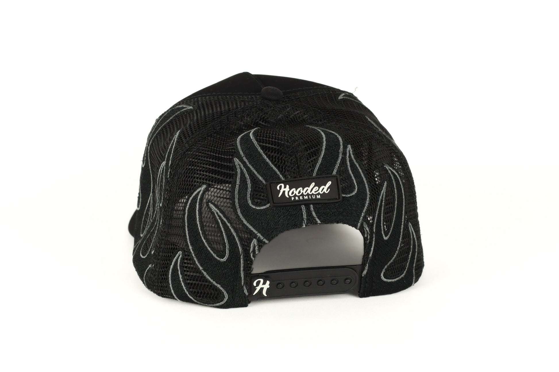 Gorra en gamuza textil con malla, bordada en cada panel para dar un diseño espectacular en varias técnicas además de los distintivos premium de hooded en cada detalle